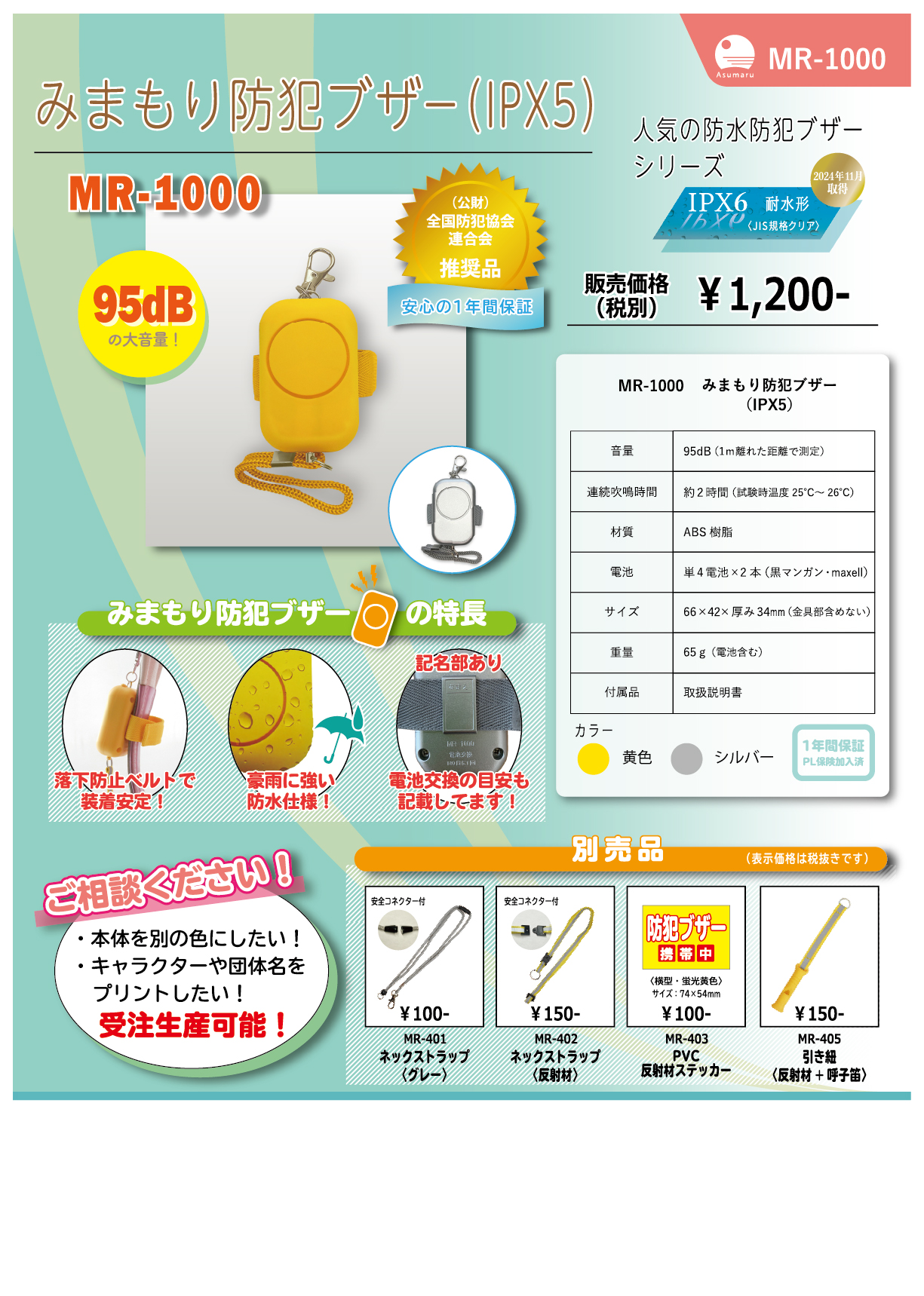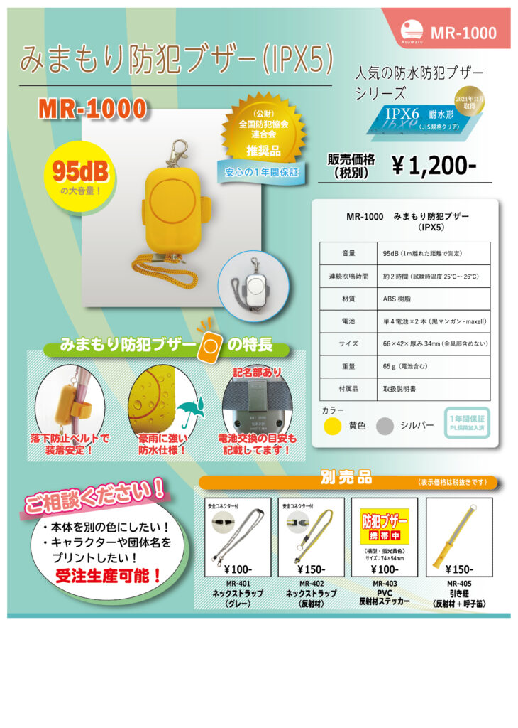 MR-1000 みまもり防犯ブザー(IPX5)MR-1000 2023年11月16日 お問合せ〒116-0013東京都荒川区西日暮里2-17-10 アクセスキクヤビル3Fあすまる株式会社TEL:03-5604-5858 FAX : 03-5604-5838メール : info@asumaru.co.jp